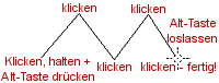 Was wir hier nutzen werden ist eine weitere Eigenschaft aller Zeichen-Werkzeuge: Wenn man beim Zeichnen die Alt-Taste gedrückt hält, kann man eine Linie an der zuletzt gezeichneten anfügen. Mit der Normal-Linie kann man auf diese Weise schöne Zickzacklinien zeichnen. Probiert es einmal in einem neuen Bild aus!